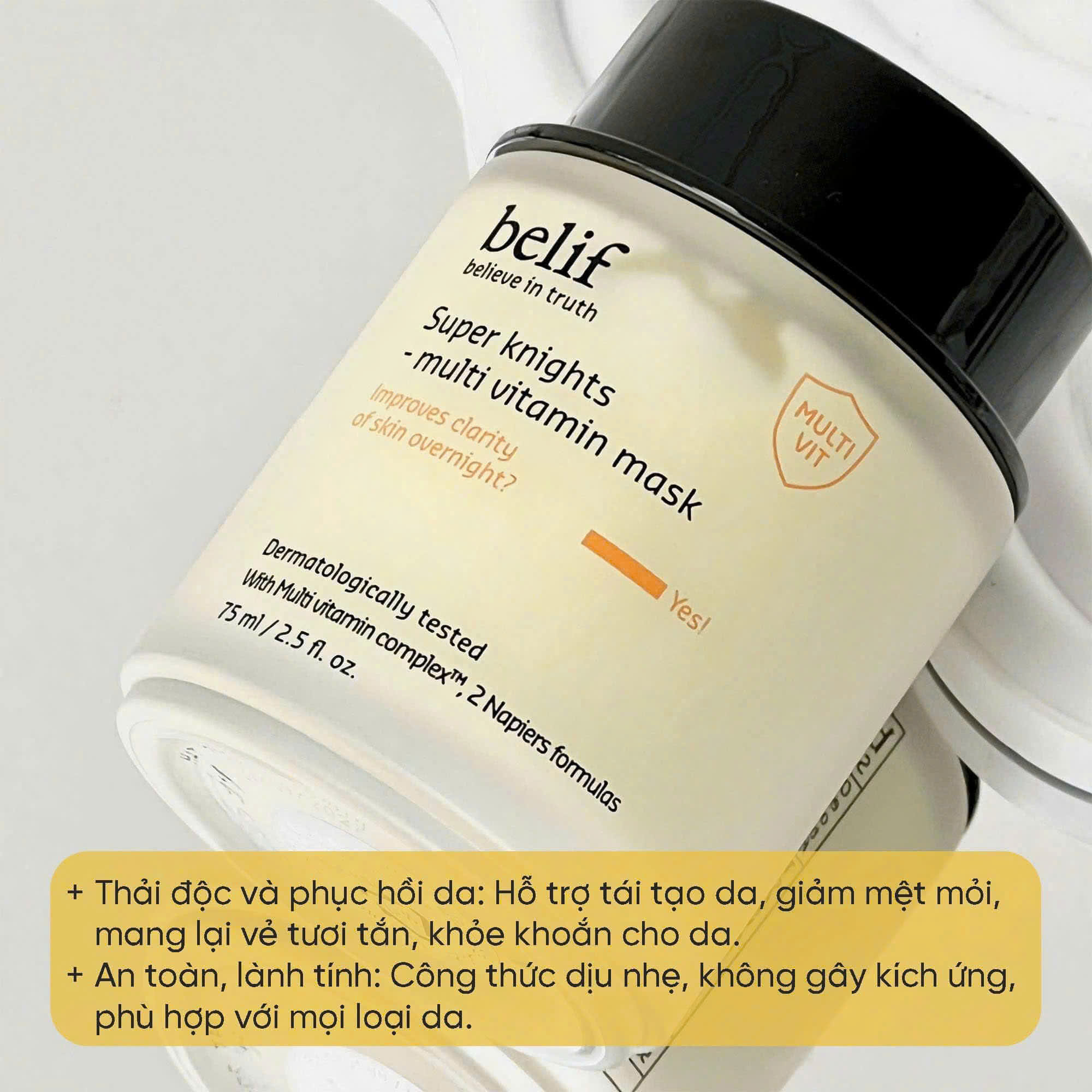 Mặt nạ ngủ belif Super Knight Multi Vitamin Mask là “siêu phẩm” phục hồi và bảo vệ làn da trong giấc ngủ. Làn da được cải thiện bừng tỉnh đầy sức sống, căng mịn ẩm mượt vào sáng hôm sau: